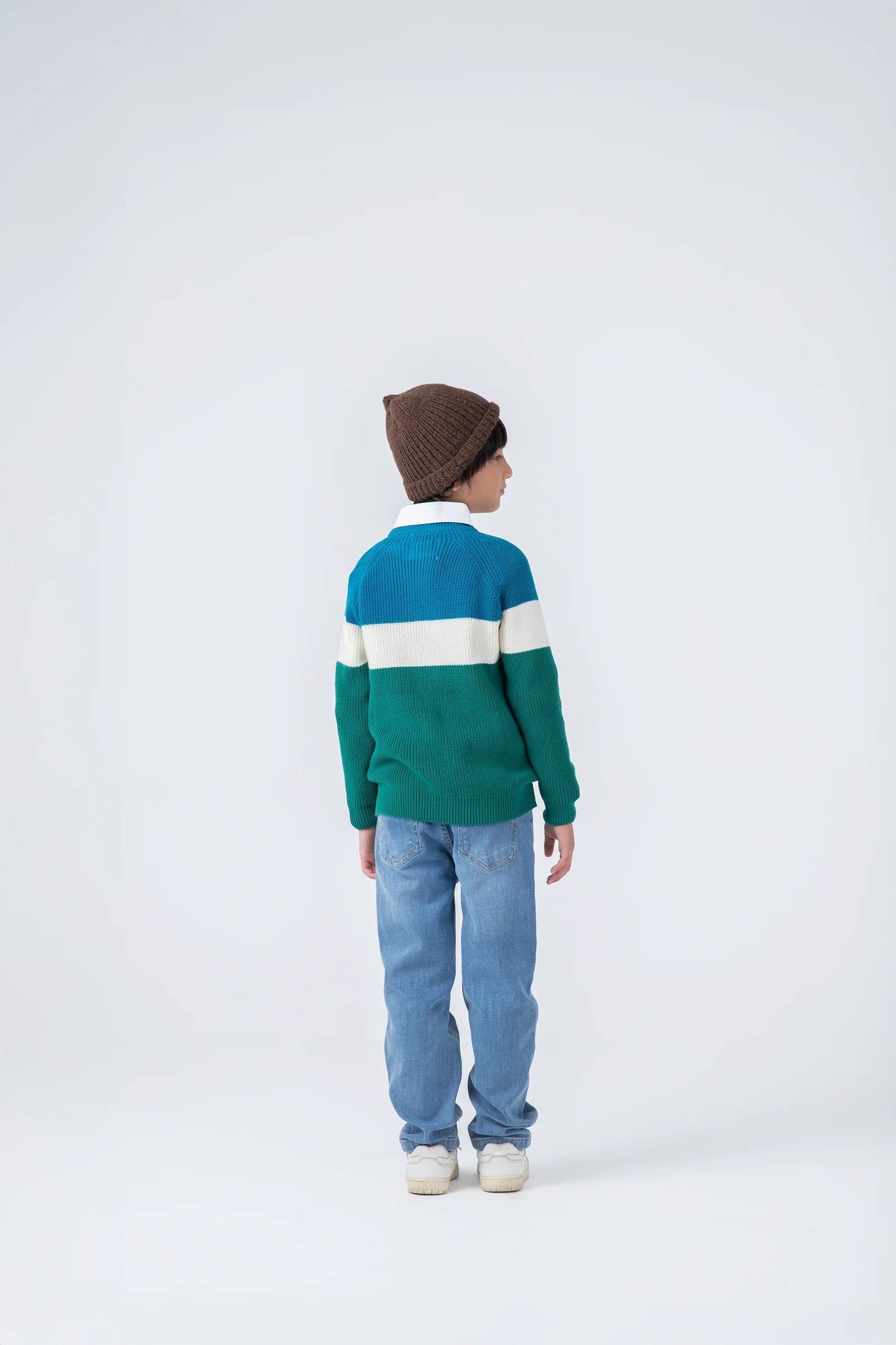 Bold color blocks of teal, white, and green meet ribbed texture in this statement sweater. The stretch-knit construction offers a snug yet flexible fit, while the drop-shoulder cut adds urban flair. Easy to throw on, hard to miss—perfect for layering through cooler days with both comfort and confidence.