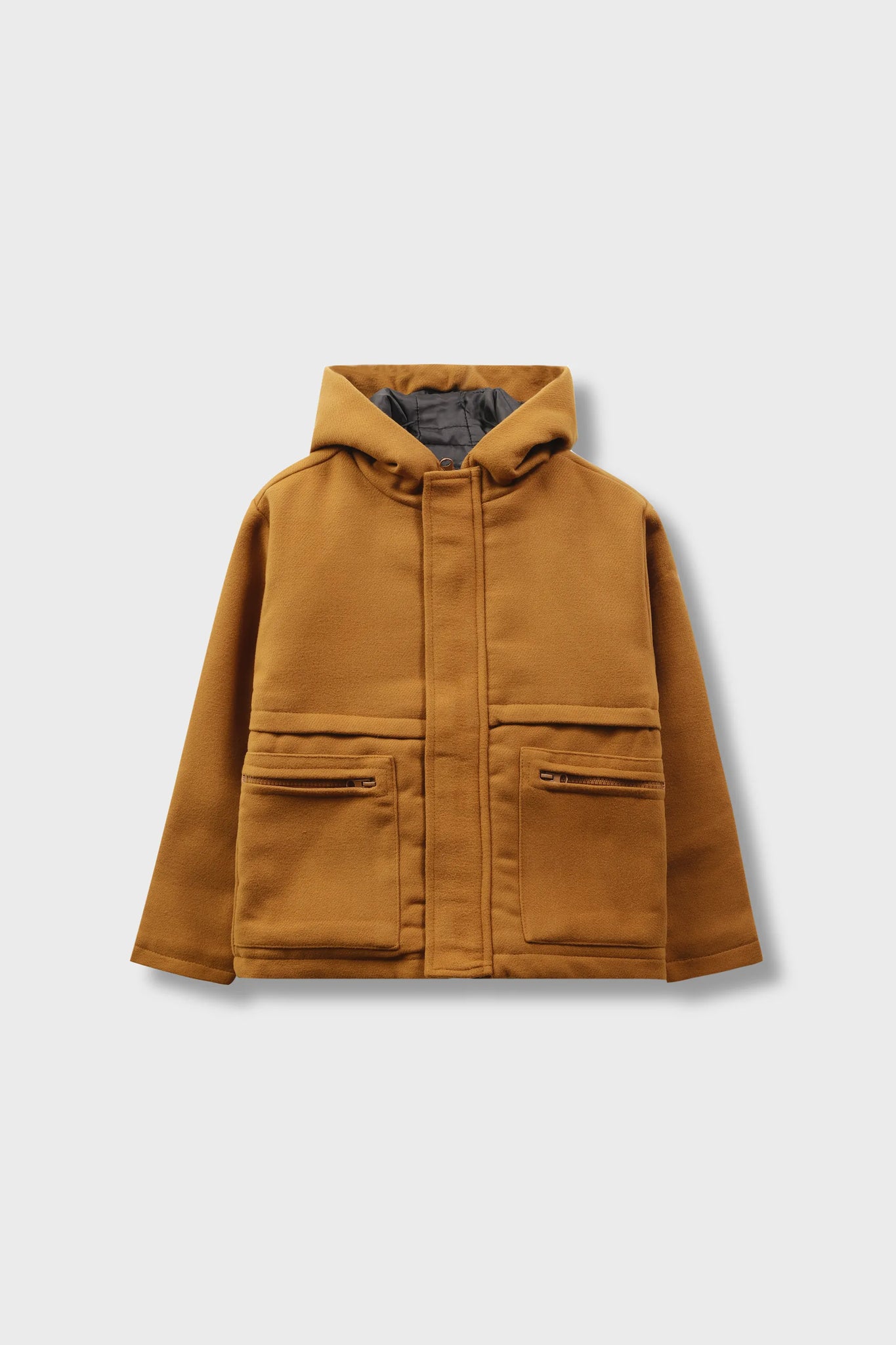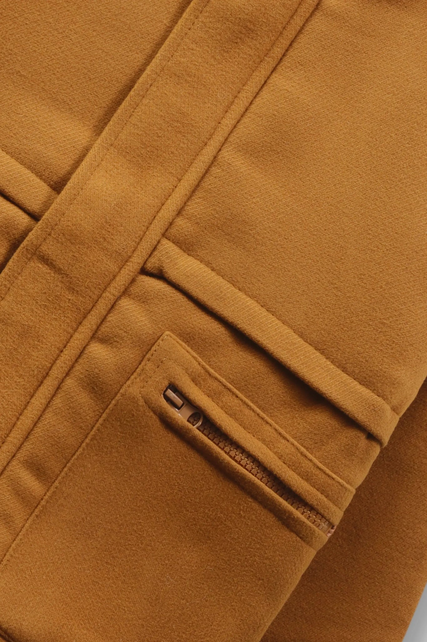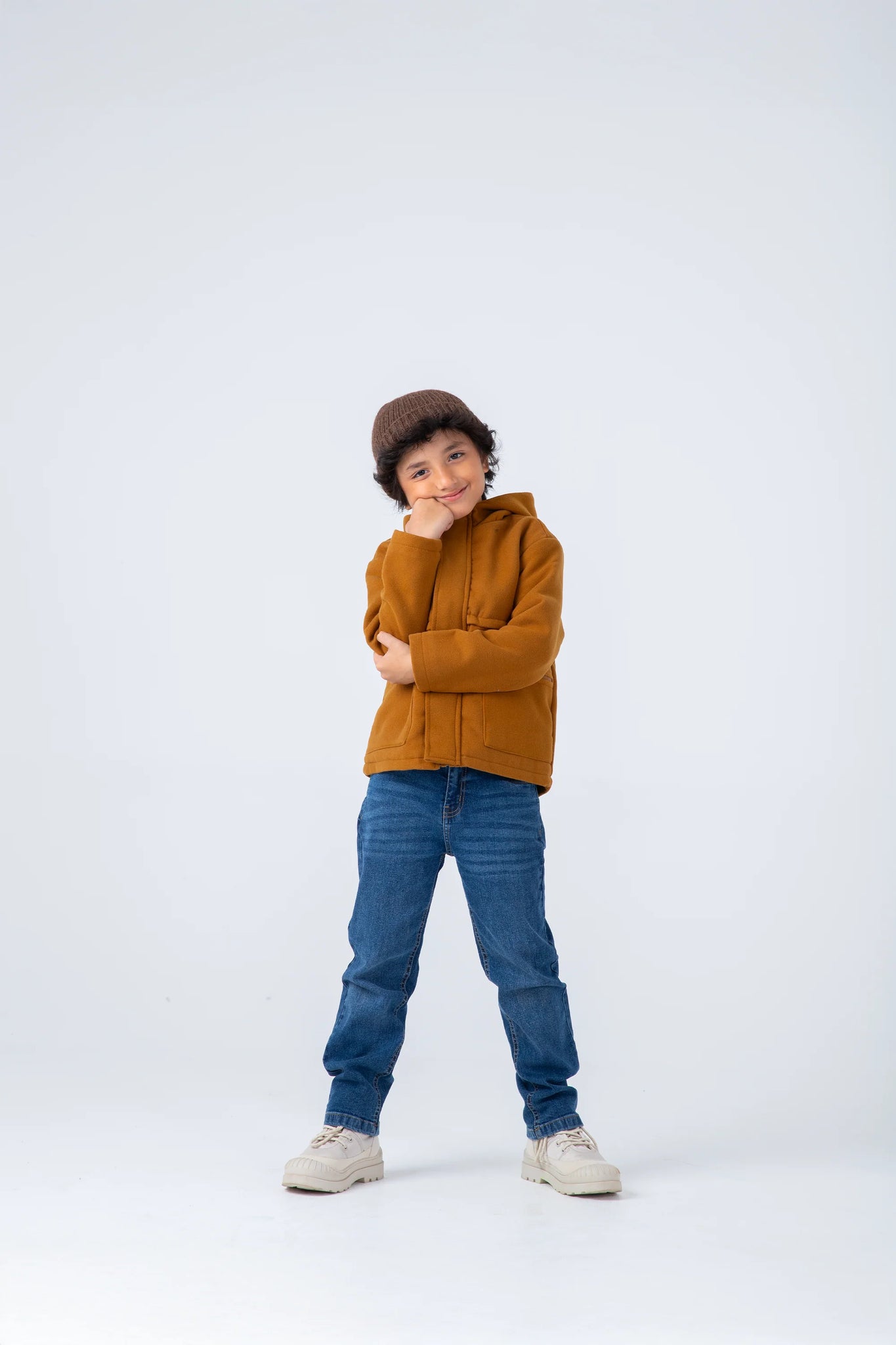 Gear up for adventure with this dark mustard felt hooded jacket. Featuring a front button closure with a hidden zipper, two sleek zipped pockets, and long sleeves, it combines functionality with style. The straight hem and cozy hood offer warmth and comfort, making it a perfect choice for chilly days.