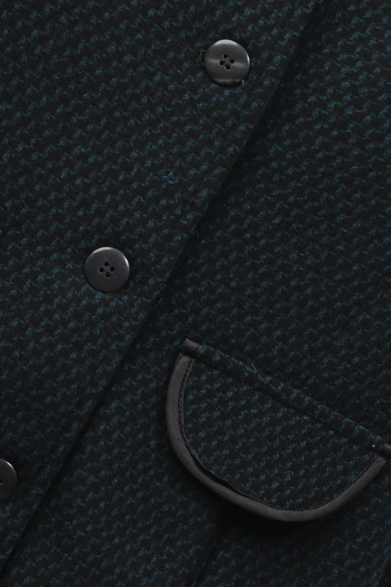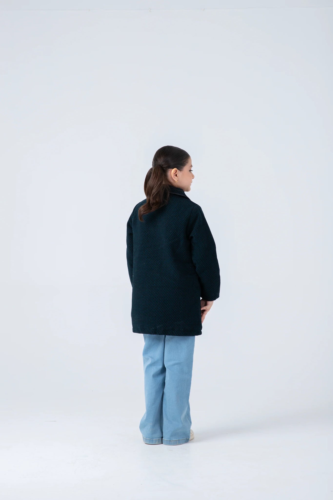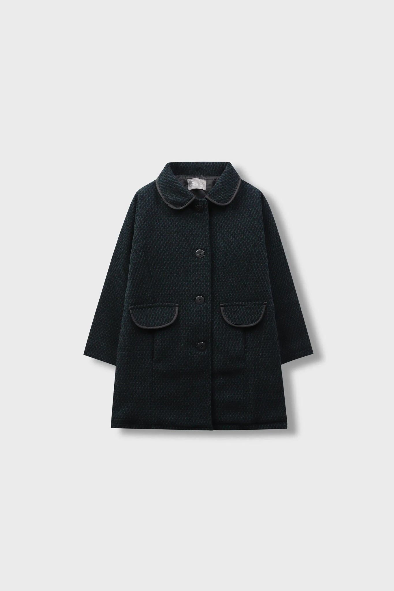 Designed for elegance and warmth, this black felt coat is perfect for your little one. With a cute collar, two flap pockets, and sleek side panels, it’s full of adorable details. The straight sleeves make it easy to layer over her favorite outfits, adding a stylish touch to her winter wardrobe.