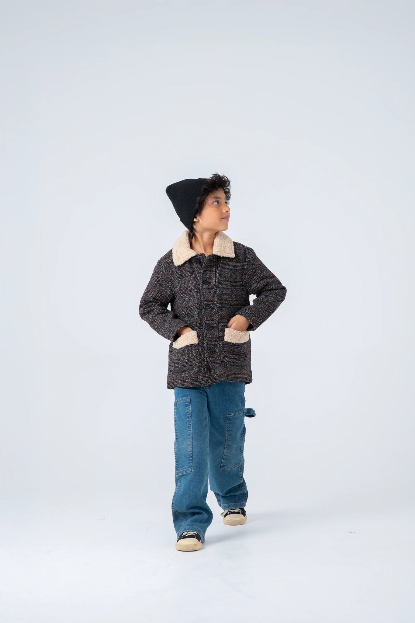 Wrap him in timeless style with this dark brown felt jacket. The beige fur collar and pocket openings add a cozy contrast, while the front button closure provides classic functionality. Designed with two round-edge pockets, this jacket ensures warmth and convenience, perfect for chilly days.