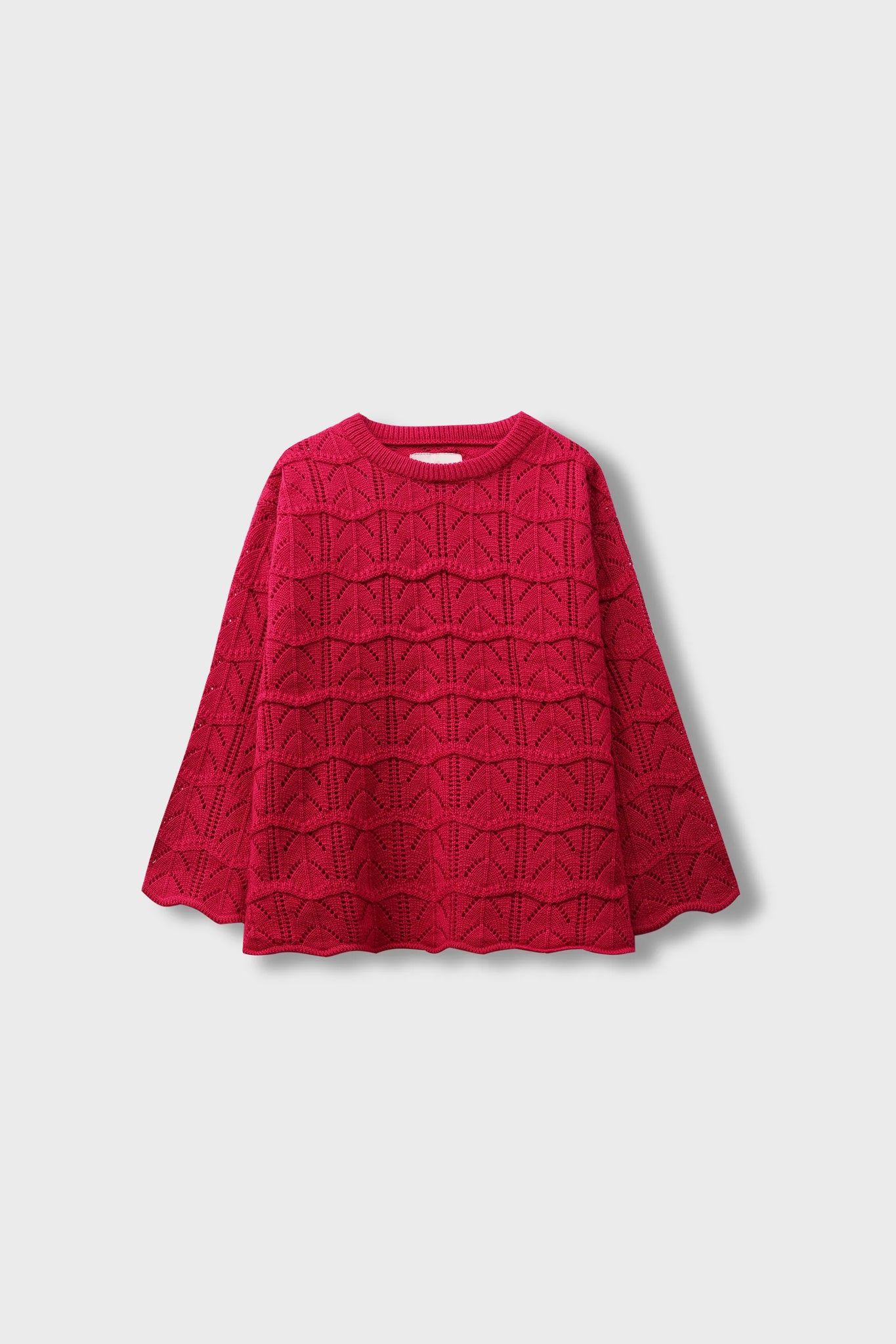 A charming pop of pink in a playful knit pattern, the Rosy Bloom is crafted from soft acrylic wool with delicate all-over pointelle details. Lightweight yet cozy, it is perfect for layering or wearing solo. Add tights or a skirt, and she is ready to bloom in style.