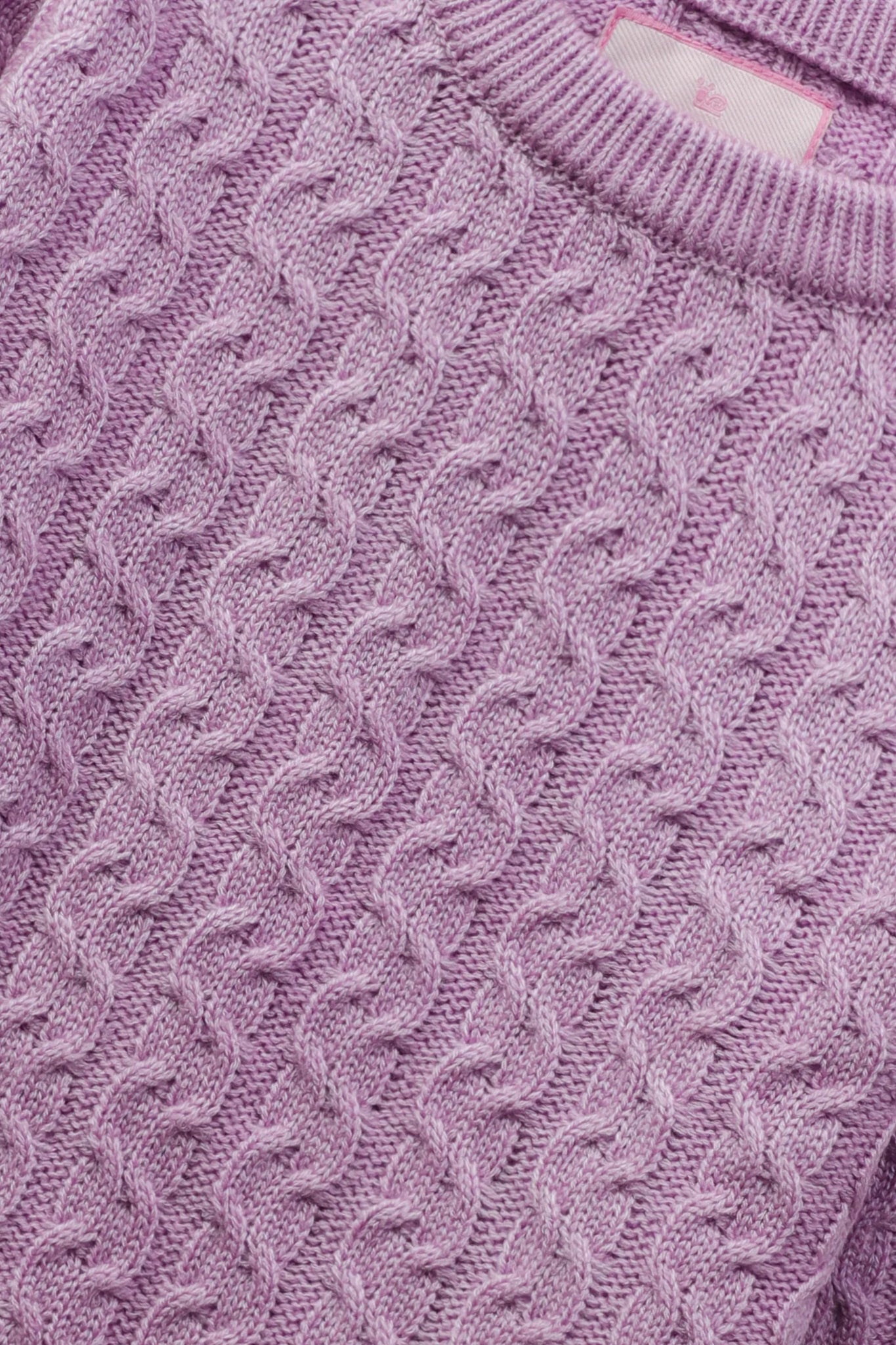 A cozy lilac sweater made from premium acrylic fabric for lightweight warmth and lasting comfort. The intricate cable knit pattern adds texture and charm, while the ribbed cuffs and hem ensure a snug fit. Perfect for chilly days and stylish winter layering.