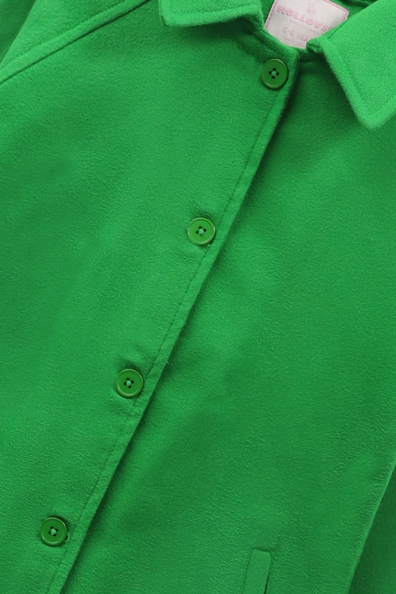 Fresh like spring mornings, this green felt coat combines a clean straight hem with raglan-cut sleeves for playful ease. Topped with a classic collar and front button closure, it’s equal parts trendy and timeless. The perfect pick for crisp outings, garden parties, or a fancy layer on the go.
