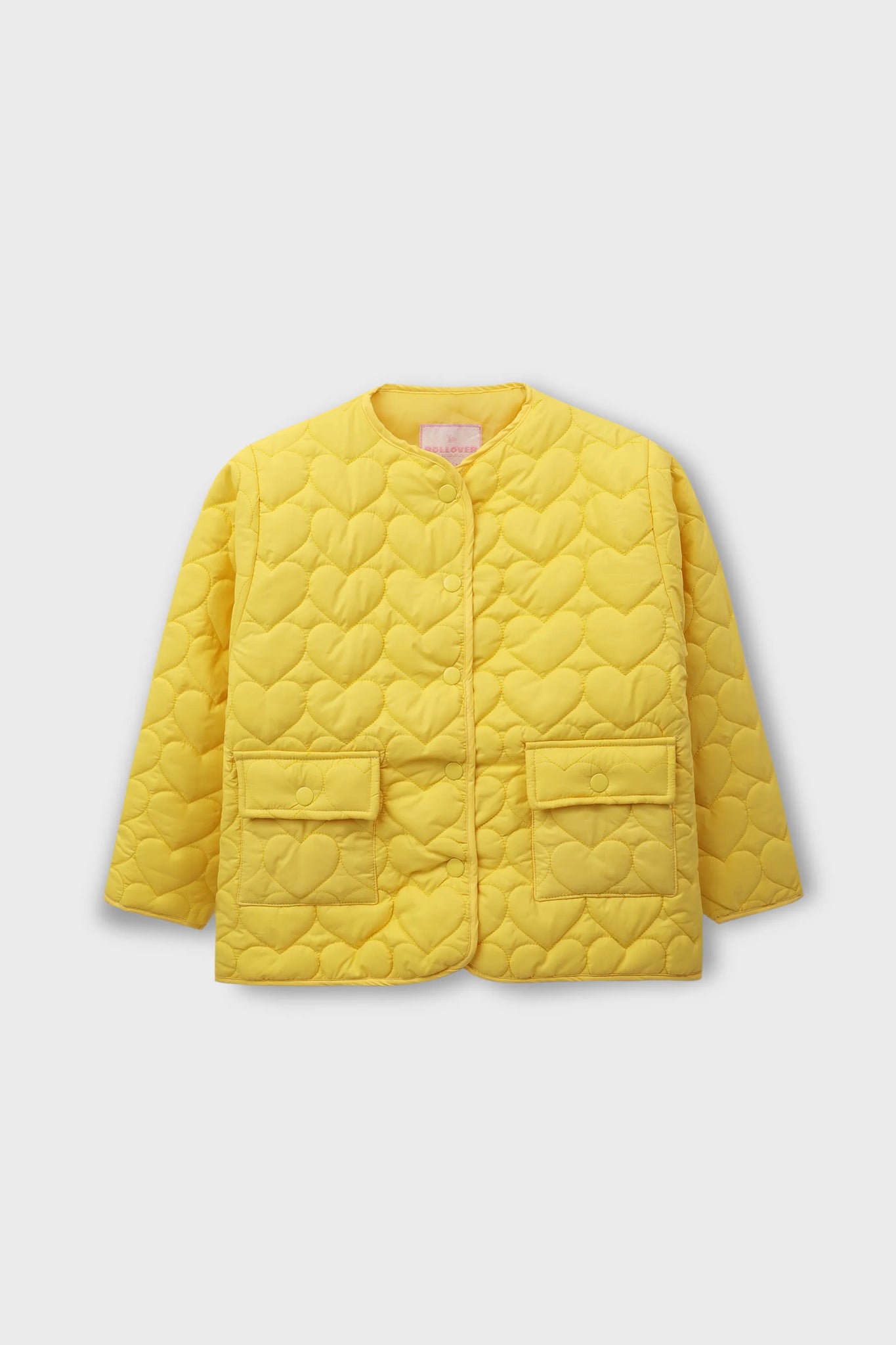 Bright as her energy, yellow quilted jacket is crafted from lightweight bubble parachute with heart-shaped quilted detailing that stands out in every light. With two flap patch pockets and a classic button front, this jacket blends charm and comfort for everyday layering with a pop of joyful yellow.