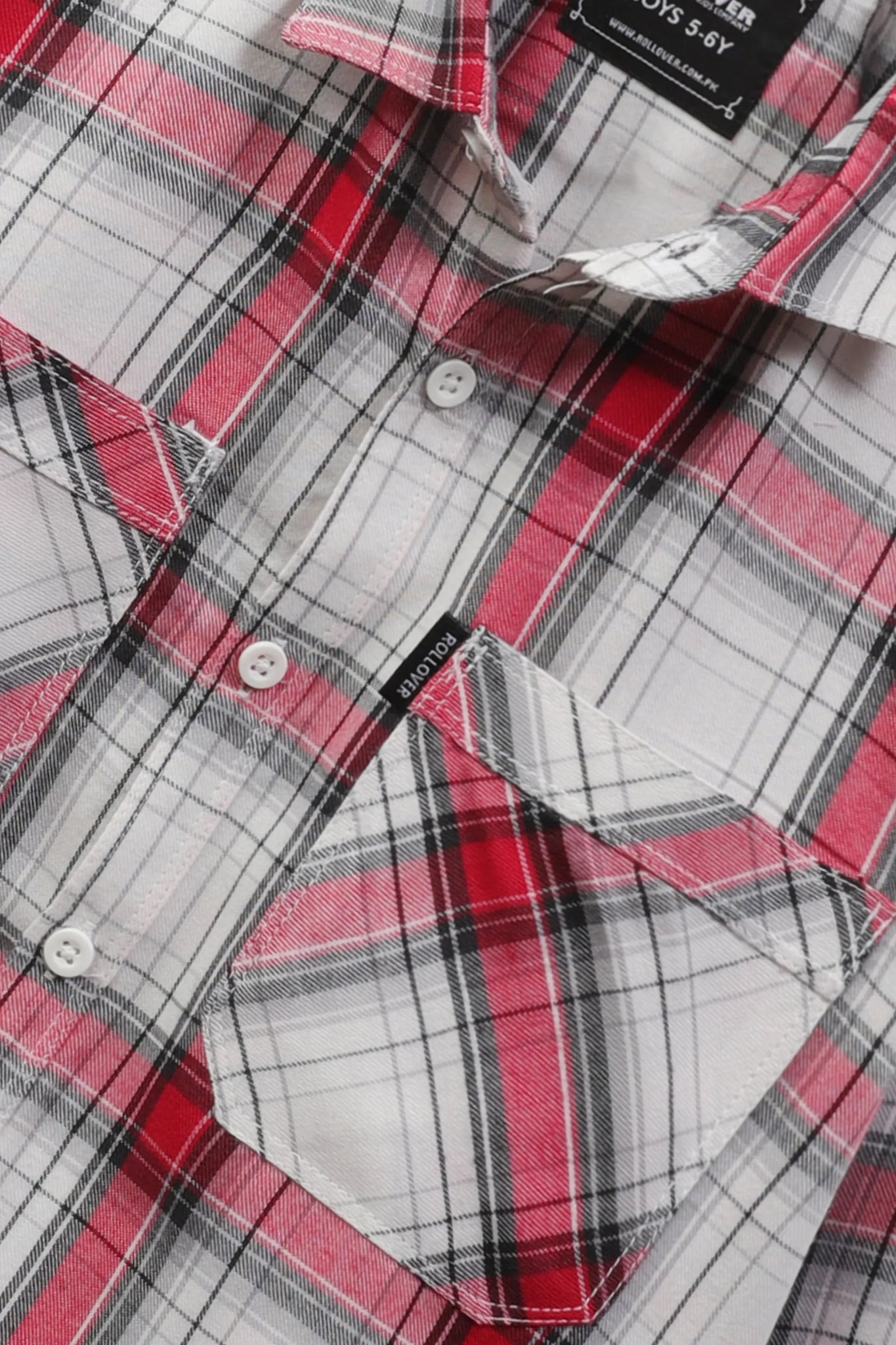 Turn up the style with this timeless red-and-white plaid shirt. Lightweight cotton keeps it breezy, while the angled chest pocket adds a twist. Designed for school days or weekend adventures, it's an effortlessly cool choice that blends heritage patterns with modern comfort.