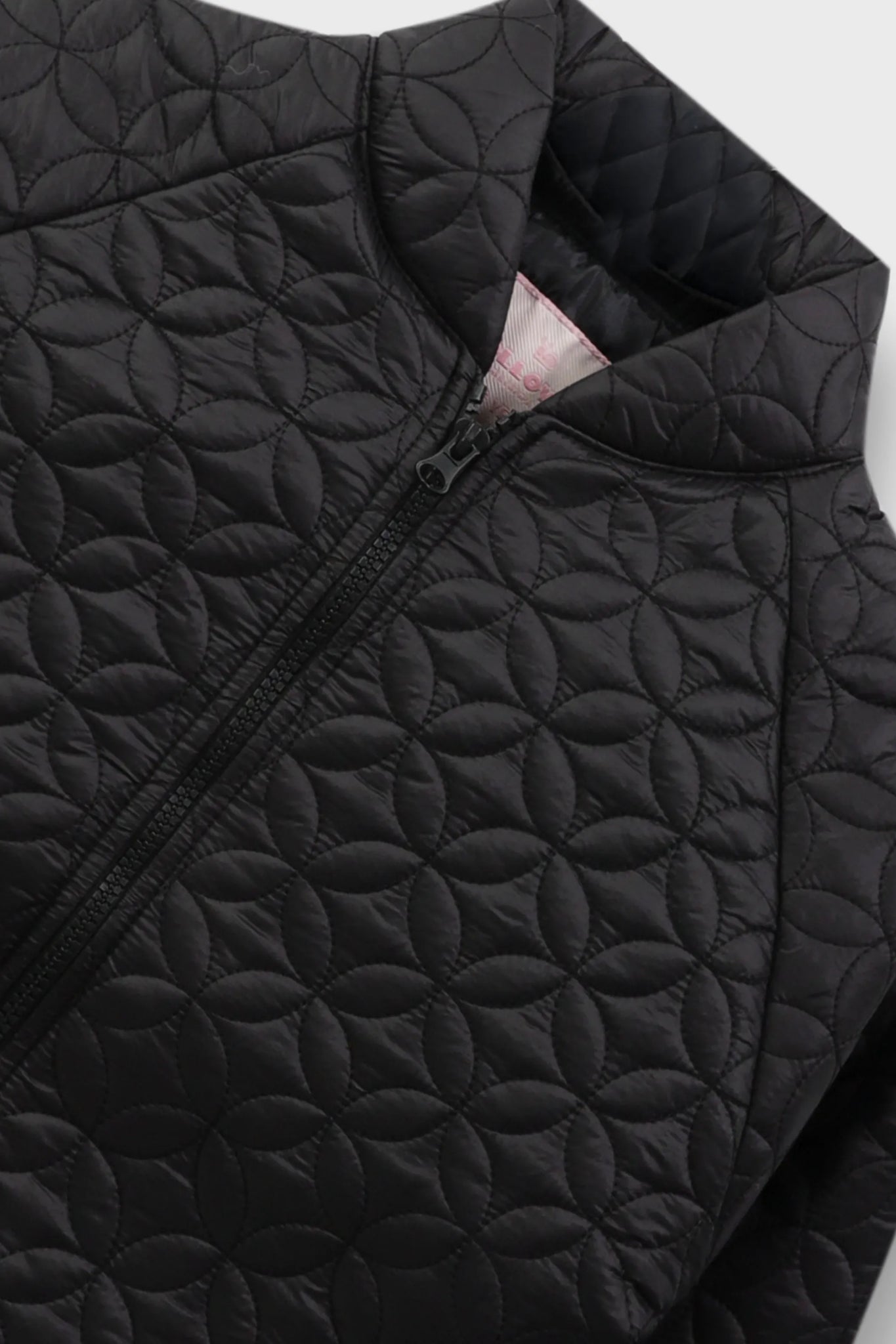 Sleek, sporty, and oh-so-stylish; this black jacket is a winter essential. With a high neckline, full-length sleeves, and geometric stitched surface, it stands out in the crowd. The glossy texture and clean zip-up design create an effortlessly cool silhouette made for playful strolls and polished weekend looks.