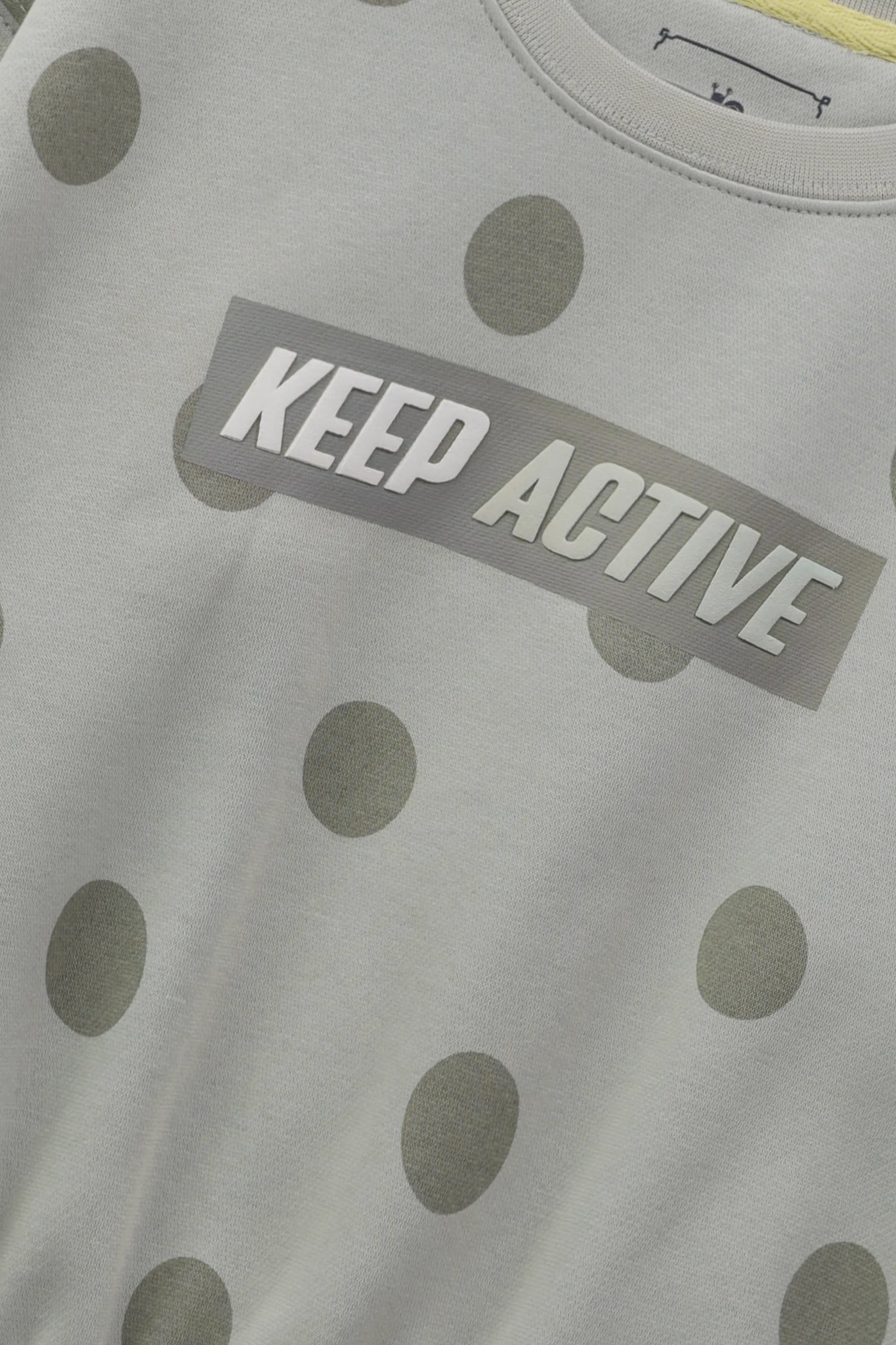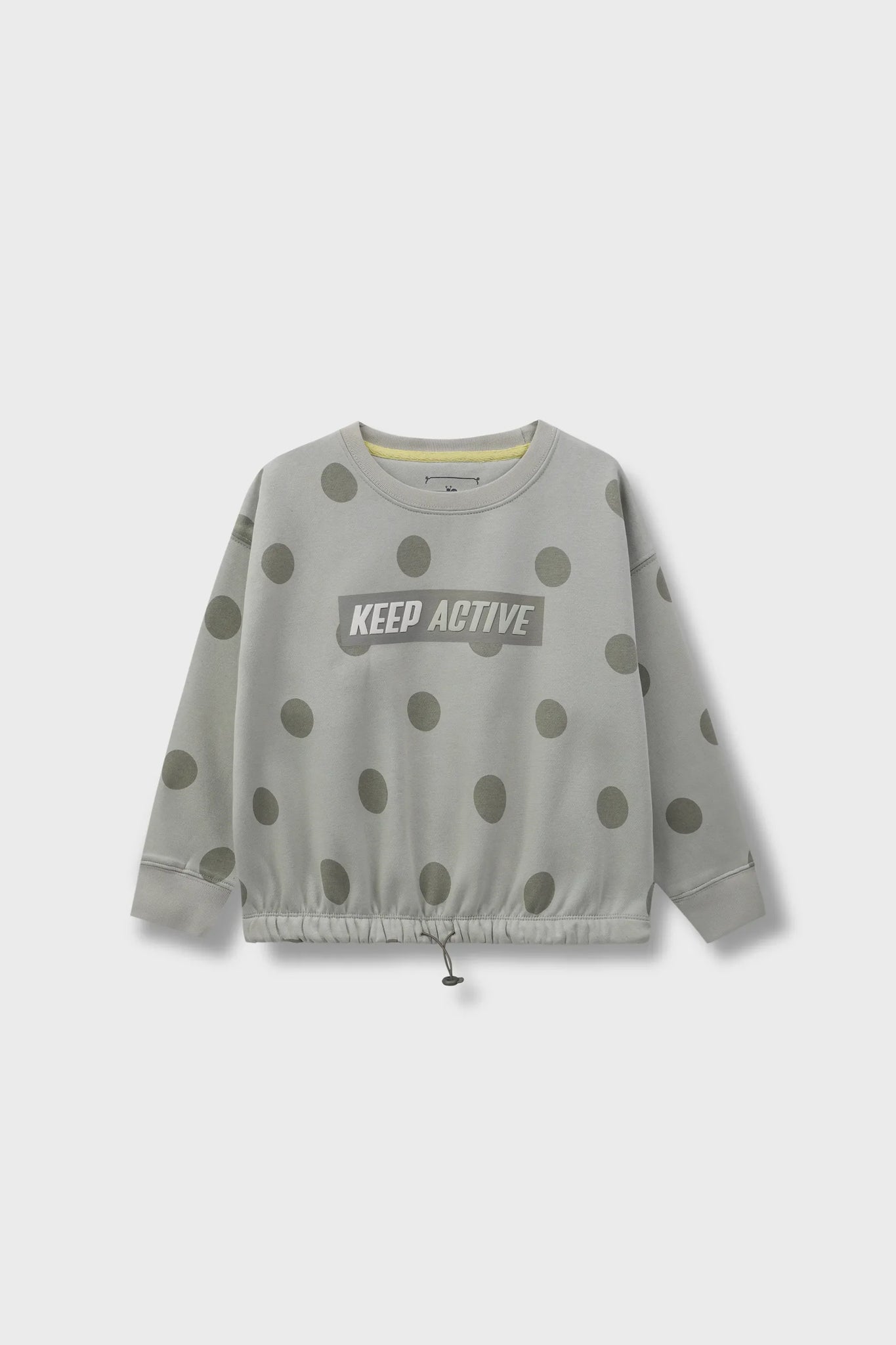 Stay playful, stay active! This sage green fleece sweatshirt is bursting with oversized polka dots and bold attitude. A sporty “KEEP ACTIVE” print energizes the front, while the ruched drawstring hem adds street-style flair. It’s the perfect fusion of motion-ready comfort and runway-cool vibes.
