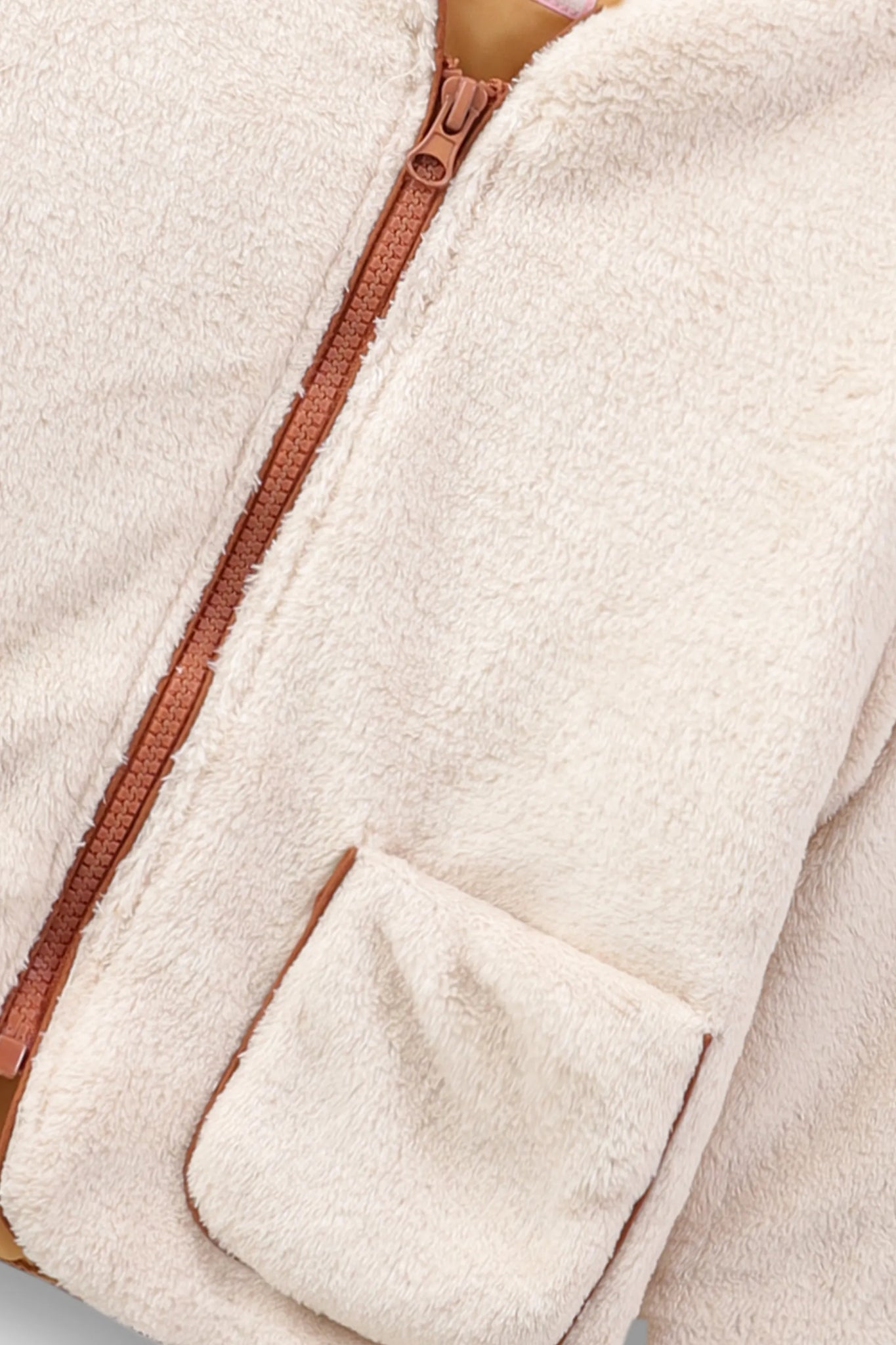 Wrap her in softness with this plush polar fleece jacket, designed in a dreamy skin tone with brown piping at the neckline, cuffs, and pockets. The round V-neck and straight-cut hem keep it clean and chic. Inside, a silk lining adds a luxe finish. Cozy has never looked so elevated.