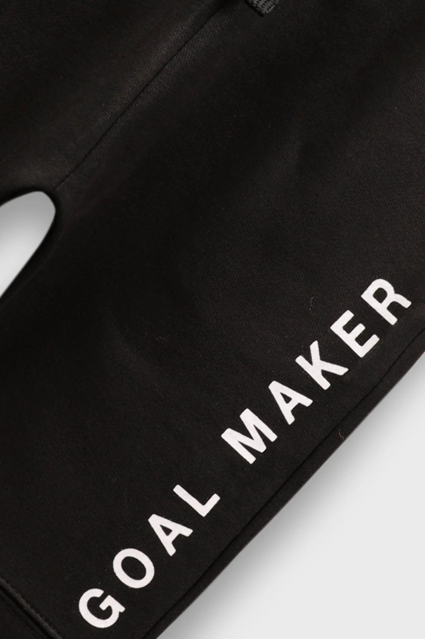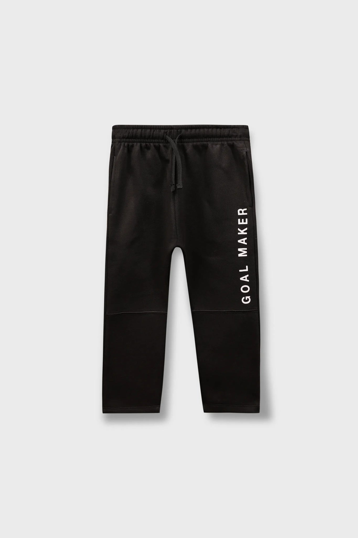Built for little champs, these black fleece trousers feature a snug elasticated waist with a drawstring for a secure fit. The bold “Goal Maker” print adds sporty flair, while the soft interior keeps it cozy. Perfect for active days, school play, or weekend lounging — style that never slows down.